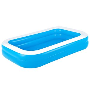 Es ideal para compartir momentos refrescantes y divertidos en familia durante los días calurosos. Con su diseño rectangular en color azul con bordes blancos, ofrece un espacio amplio y cómodo para niños y adultos. Fabricada en vinilo resistente y duradero, garantiza seguridad y estabilidad al llenarse de agua.
