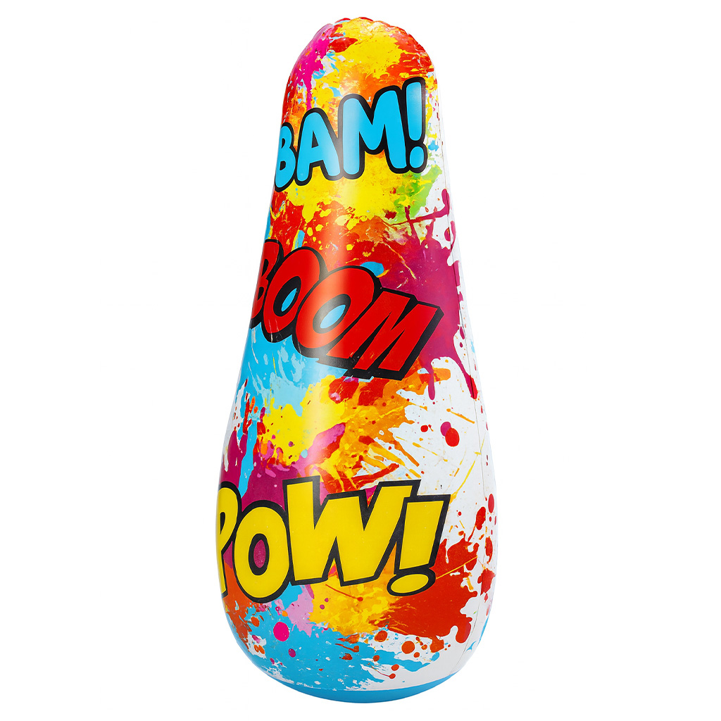 Es un divertido saco de boxeo para niños, ideal para liberar energía y fomentar el juego activo. Su diseño colorido inspirado en cómics, con palabras como BAM!, BOOM! y POW!, lo convierte en un juguete visualmente atractivo que estimula la imaginación.