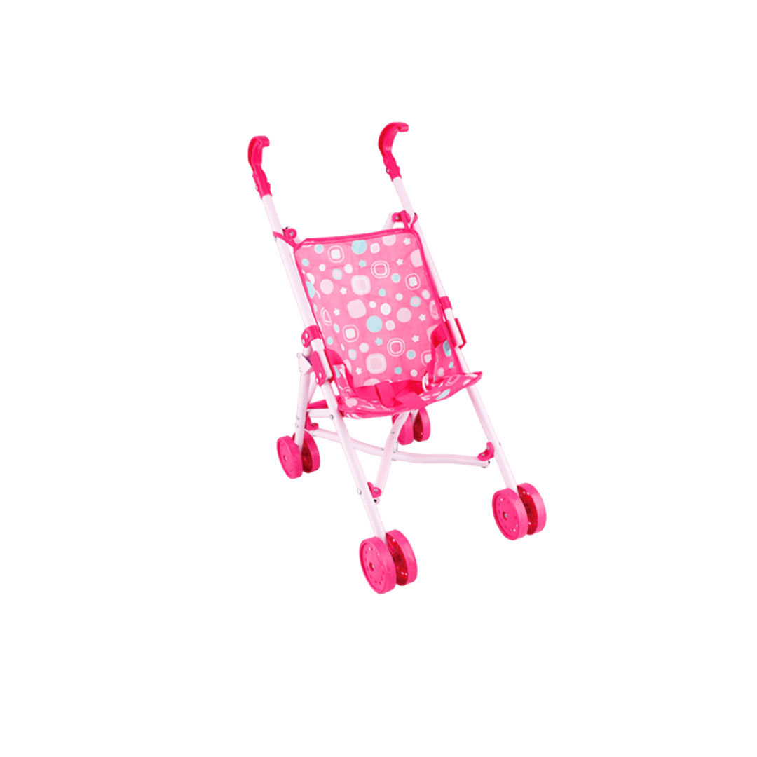 Descubre el cochecito de juguete ideal para los pequeños cuidadores de la casa. Con un encantador diseño en color rosa y un patrón de círculos y cuadrados en colores blancos, azules y rosas, este cochecito es perfecto para fomentar el juego imaginativo y el cuidado de muñecas y animales de peluche.