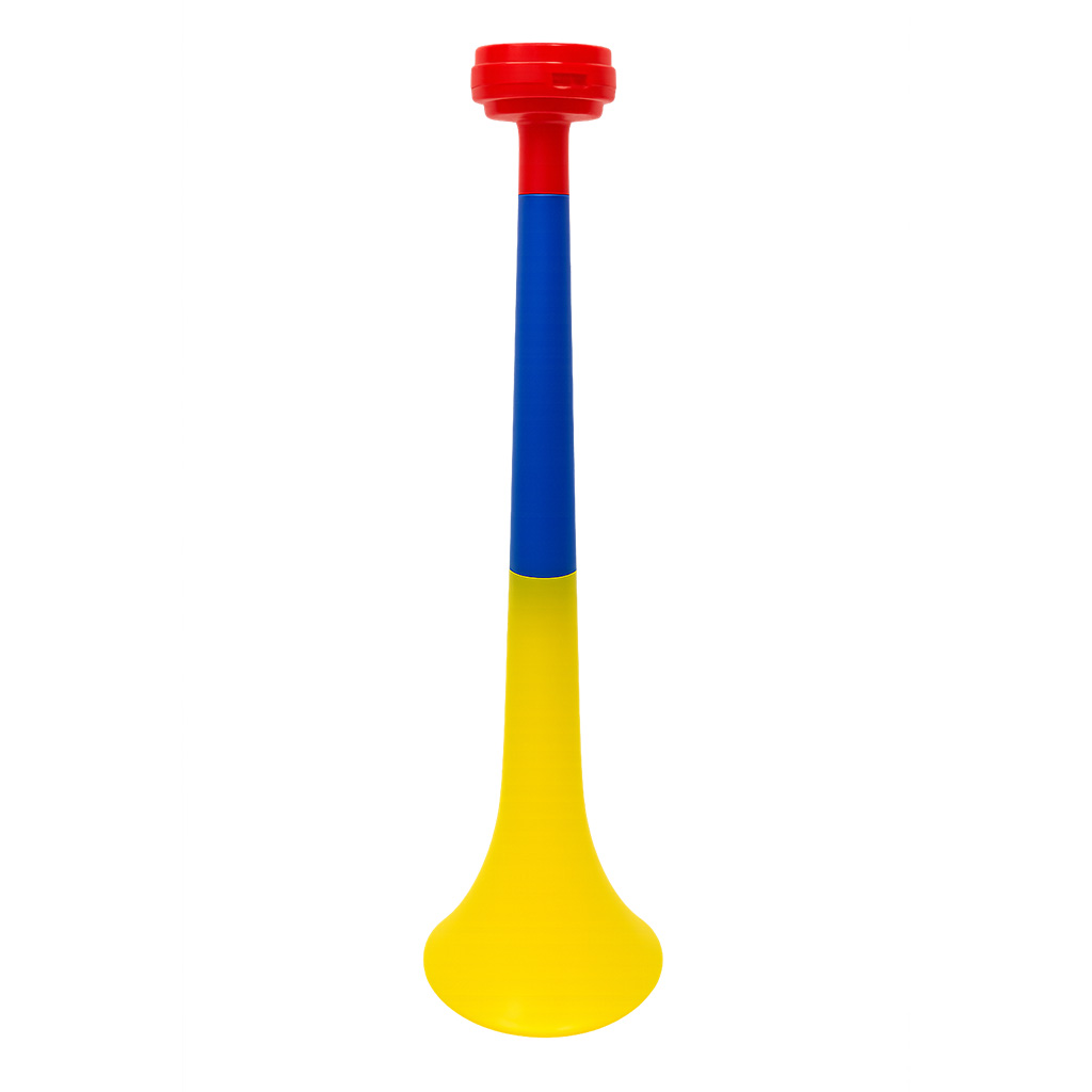 Corneta Colombia de gran tamaño, diseñada en los colores de la bandera nacional (amarillo, azul y rojo), perfecta para animar eventos deportivos, celebraciones patrióticas y reuniones sociales. Su diseño resistente y ligero permite un sonido potente que transmite alegría y entusiasmo en cualquier ocasión.