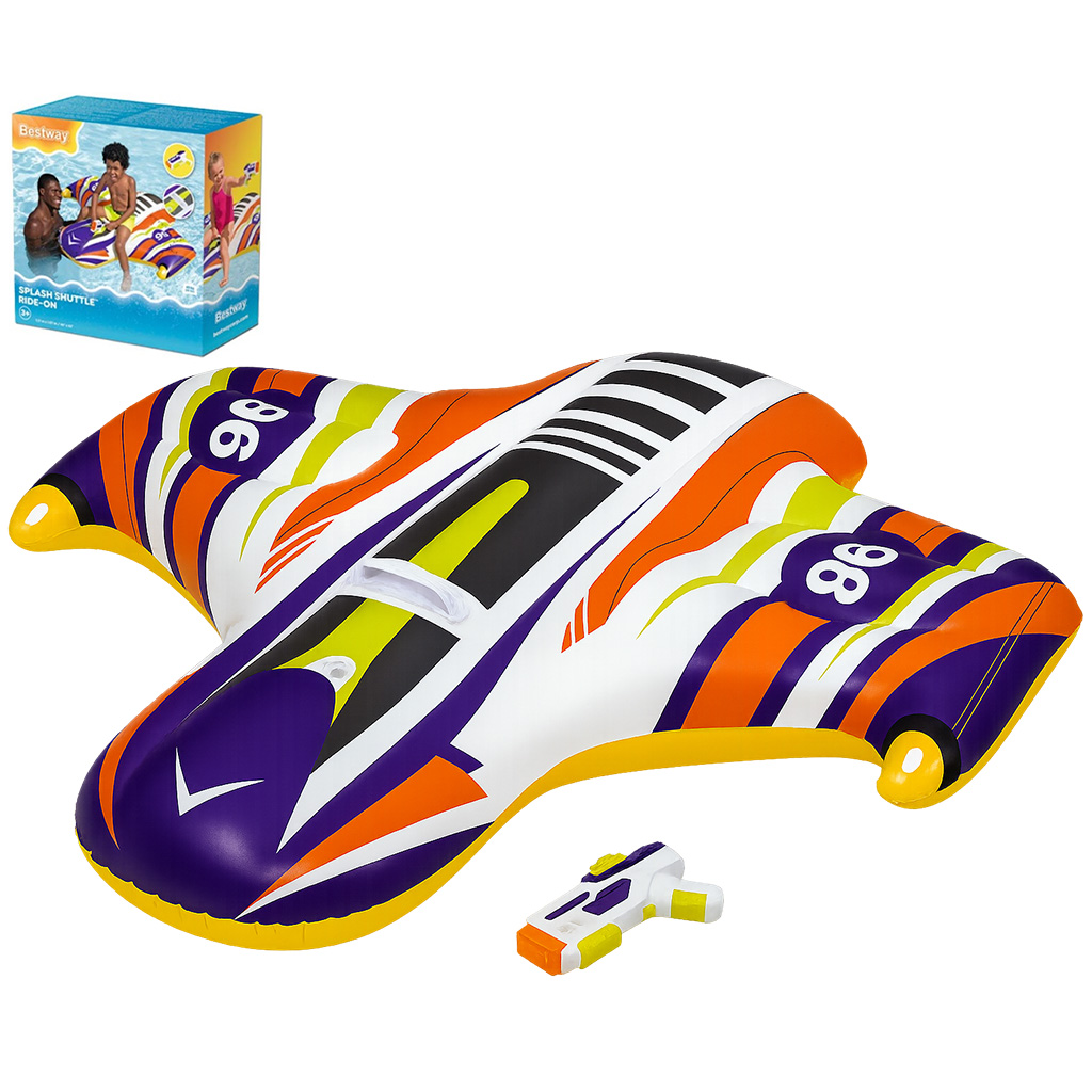 Con un diseño en forma de lancha deportiva y colores vibrantes, este flotador no solo es llamativo, sino que también incluye un sistema de pistolas de agua integrado que permite a los niños jugar y refrescarse al mismo tiempo.