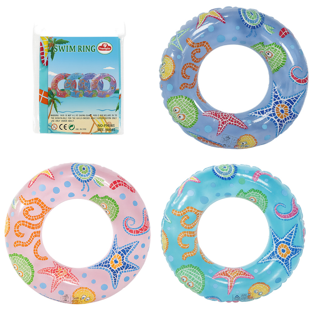 Es un aro inflable colorido y divertido, ideal para disfrutar de momentos refrescantes en la piscina o la playa. Su diseño transparente con estampados de animales marinos y tonos vivos lo convierte en un accesorio atractivo para niños y adultos.