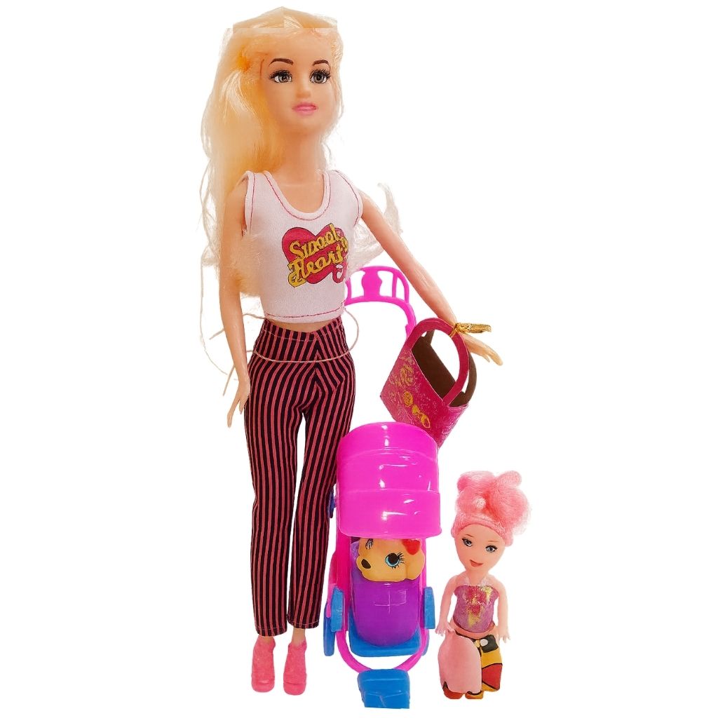 Es un juguete ideal para el juego de roles, diseñado para que los niños recrean escenas de la vida cotidiana de forma divertida. Incluye una muñeca principal, un coche tipo carrito y una mascota, lo que fomenta la imaginación, la creatividad y el desarrollo de habilidades sociales a través del juego simbólico.