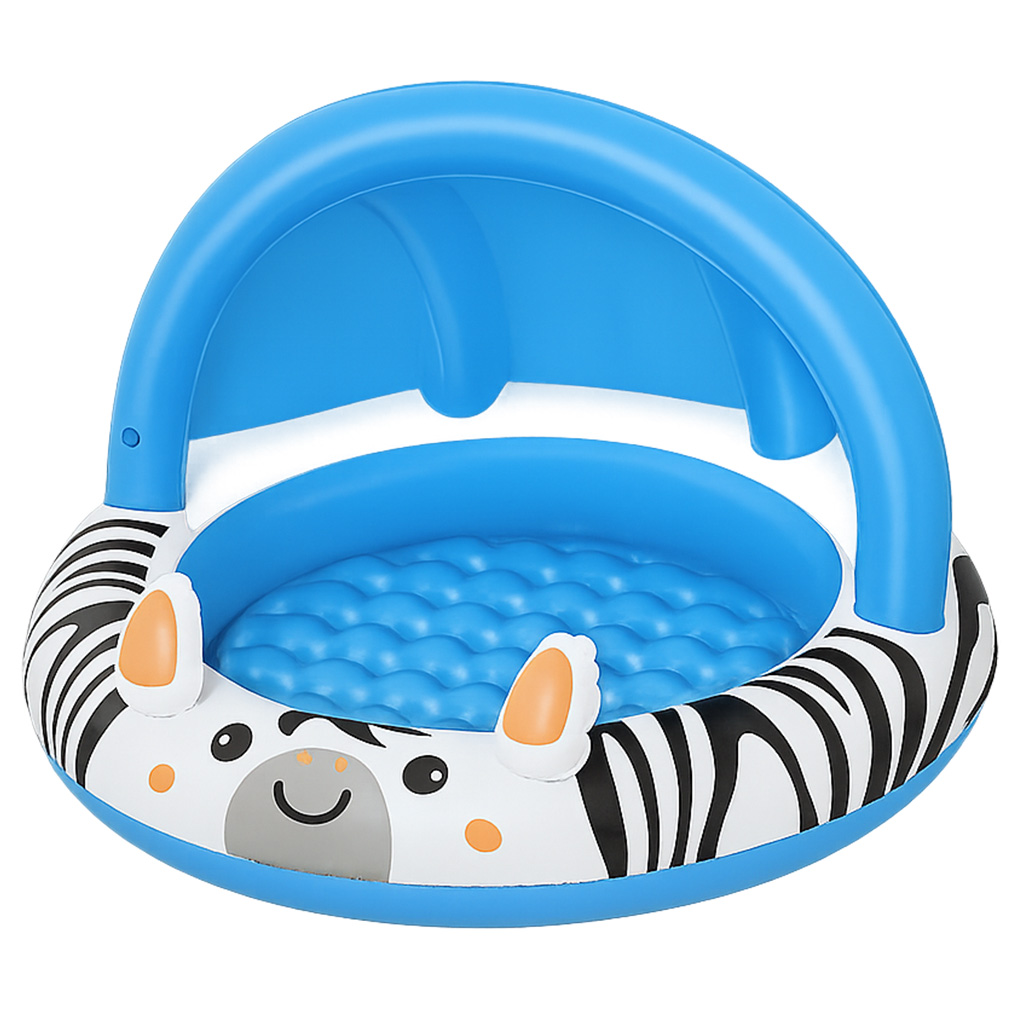 Es una adorable piscina inflable diseñada especialmente para los más pequeños. Con un divertido diseño de cebra y un toldo superior que brinda sombra, ofrece un espacio seguro, cómodo y entretenido para que los niños disfruten del agua durante los días soleados.