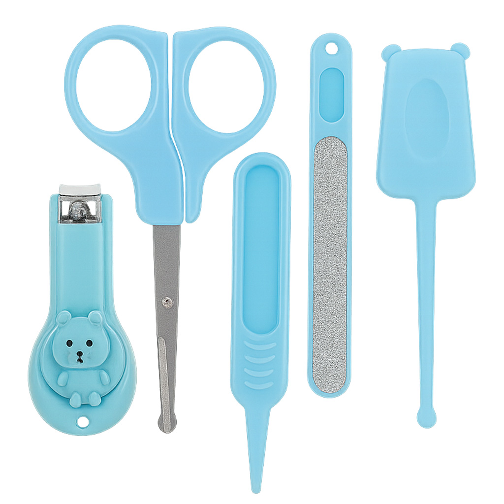1 tijeras de punta redondeada, 1 cortaúñas seguro, 1 lima para bebé, 1 pinza/ limpiador nasal y 1 herramienta auxiliar de aseo. |