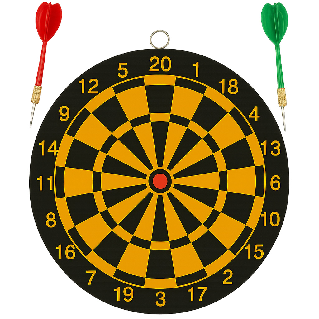 Es un clásico juego de puntería ideal para todas las edades, perfecto para disfrutar en casa, reuniones familiares o con amigos. Su diseño tradicional con fondo negro y detalles en amarillo proporciona una excelente visibilidad para los lanzamientos, fomentando la concentración, la coordinación y la precisión.