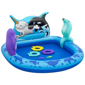 Es un espacio de diversión perfecto para los días de sol. Con un diseño marino que incluye figuras de animales como una orca, un narval y una foca, este centro de juegos estimula la imaginación y promueve la actividad al aire libre.